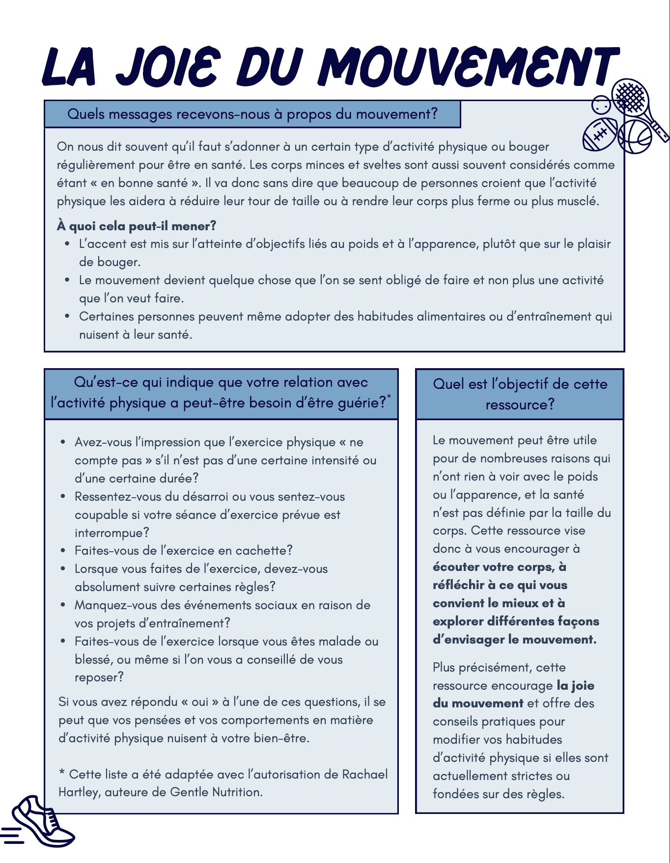 Cette ressource explore différentes façons de concevoir le mouvement et propose des conseils pratiques pour modifier vos habitudes d’activité physique si elles sont actuellement rigides ou basées sur des règles.